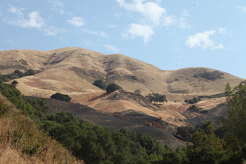 山頂的路也是平的, 路旁長了人高的草/灌木, 但沒有樹蔭, 所以還是有點曬; 但到了開闊空間, 視野變好了, 也有點微風吹, 感覺仍是蠻好的。 這一路可以遠眺對岸北緣的草坡(燒了一大塊的黑色區據說是前幾個禮拜火災的結果), 可以眺望San Jose 市區的高樓, 可以眺望前方的山色, 可以俯視山腳下的公路, 即是右手邊的山坡也有各種顏色/造型的樹葉/林木, 風景很棒, 走著一點都不無聊, 尤其四下非常安靜, 唯一的聲響就是腳邊草叢裡有動物移動的聲音, 實在是走來很舒服的步道。
